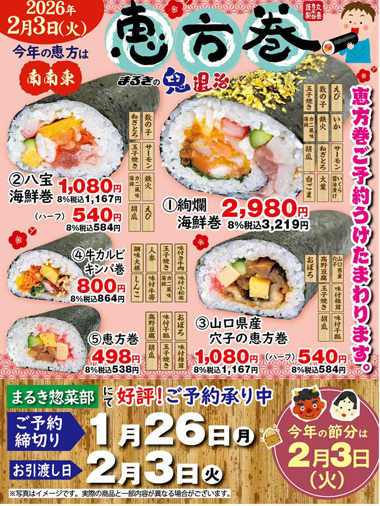 素材と味わいにこだわった「丸喜の恵方巻」ご予約承り中です。