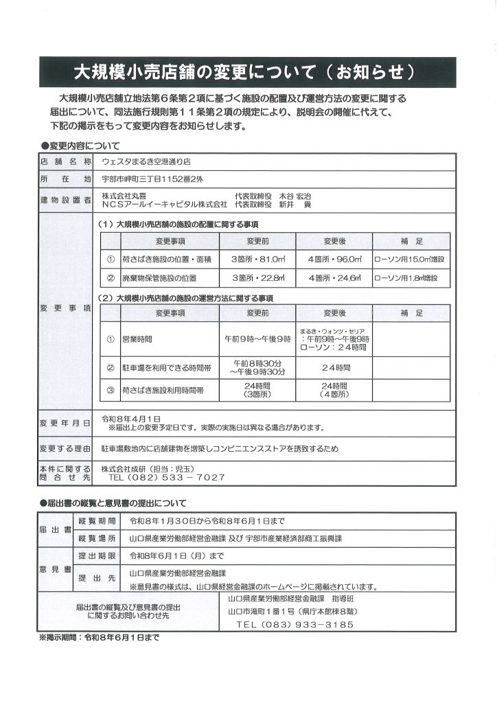 大規模小売店舗立地法第6条第2項に基づく施設の配置及び運営方法の変更に関する届出について