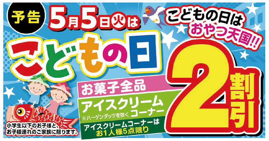 5月5日(火)は「こどもの日」お菓子&アイスクリーム2割引きセールを開催いたします!